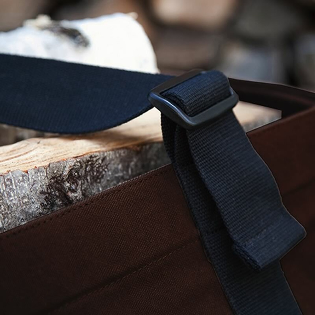 入れた薪をしっかり固定し、長さ調整もできるワンタッチバックル付き。薪の落下を防ぐほか、持ち運びに安定感が増します。